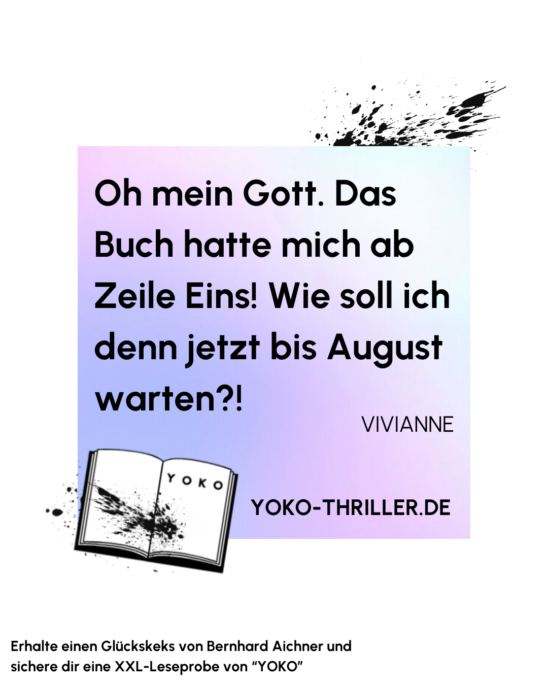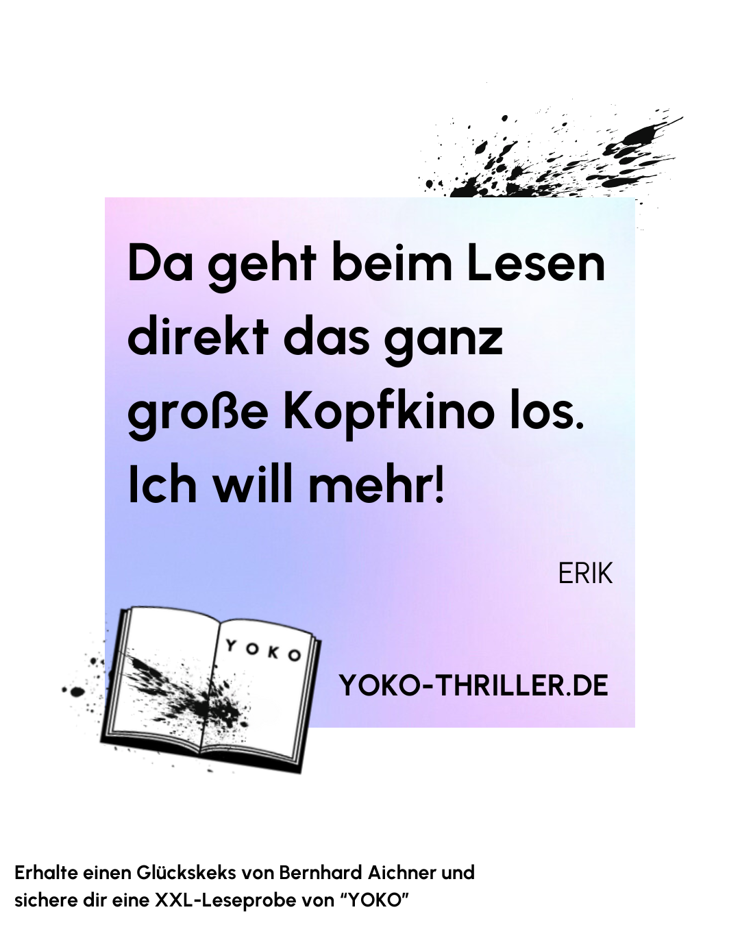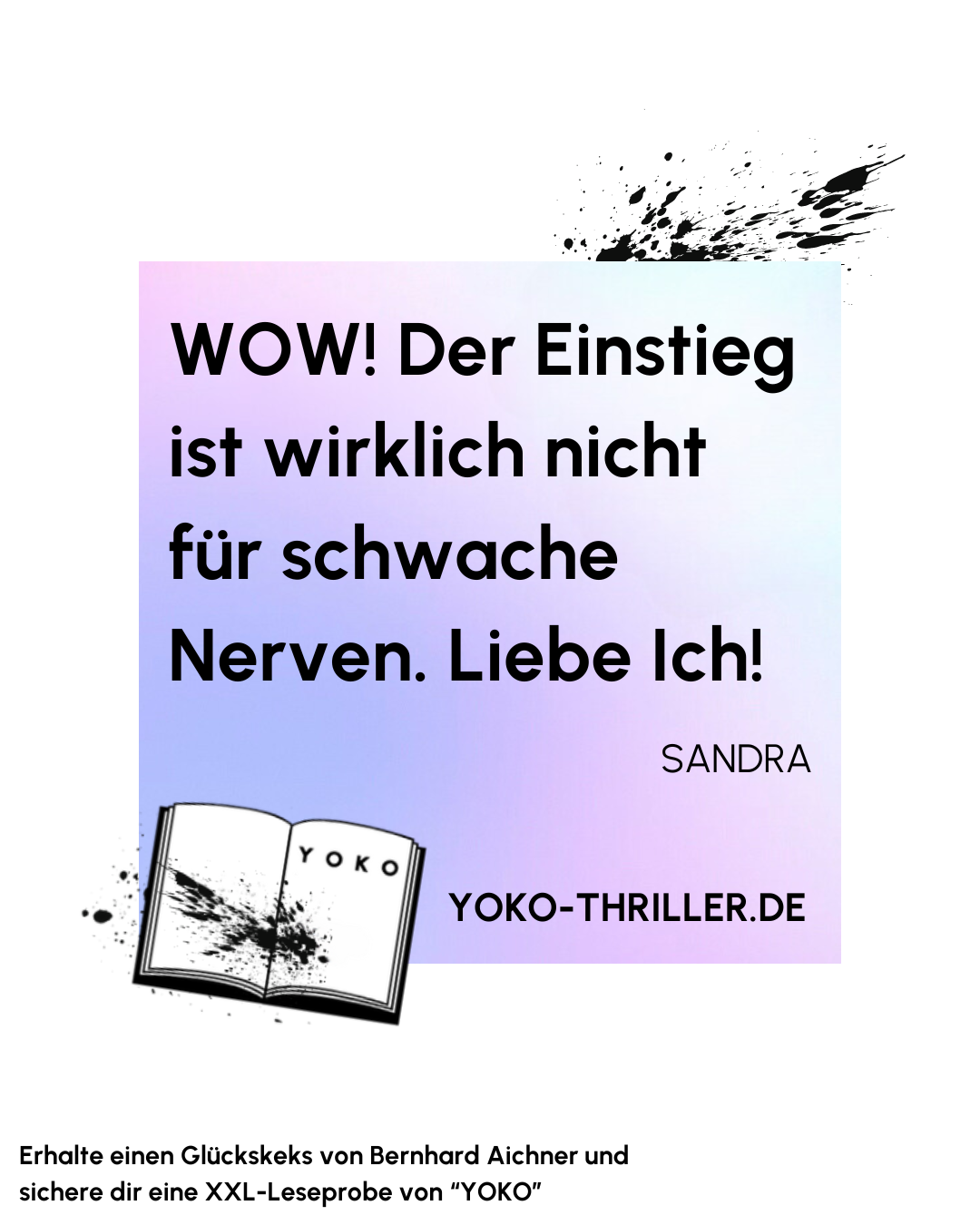 «YOKO» ist kein gewöhnliches Buch. Es ist ein Albtraum, aus dem es kein Entkommen gibt. Dieser Thriller zieht dich von der ersten Zeile an in seinen Bann. Das liegt nicht nur an der außergewöhnlichen und spannungsgeladenen Story, sondern auch an der einzigartigen Erzählweise von Bernhard Aichner, die süchtig macht und dafür sorgt, dass du der Titelheldin ganz nah kommst.